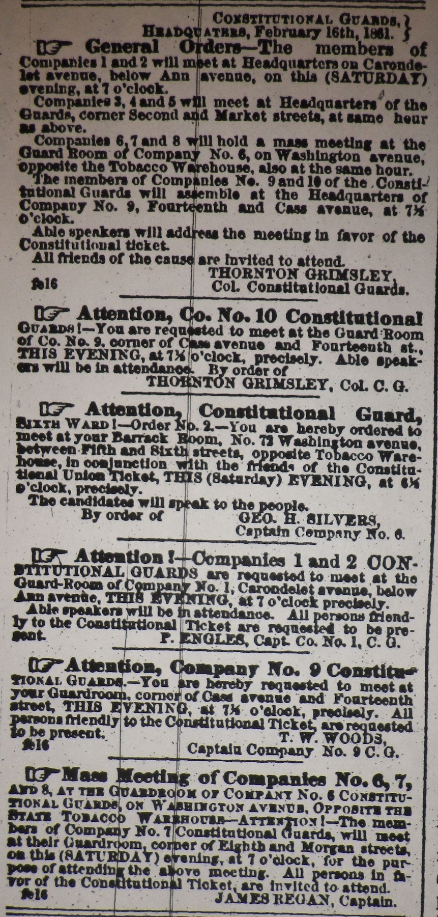 The announcements to the right were published in the February 16, 1861 edition of the MISSOURI REPUBLICAN. They are the orders from Grimsley and his subordinate “officers” ordering the “Guards'” ten companies to mobilize that night. These postings were part of a series of articles to mobilize partisans for a rally on the evening of Febuary 16th in support of the “Constitutional Union” slate of candidates (generally viewed as a mix of “conservative”, i.e. pro-slavery, Unionists of varying enthusiasm) for election to the approaching state Constitutional Convention. Despite the MISSOURI REPUBLICAN’s official disdain for the Republican Party and the President-Elect, at the time the paper was advocating for a policy of state “neutrality” to keep Missouri on the sidelines of  the developing conflict. The REPUBLICAN’s editors and other Conditional Unionists seemed to have viewed the “Constitutional Guards” (militant neutralists?) as a useful counterweight to pro and anti-secession militants active in St. Louis.